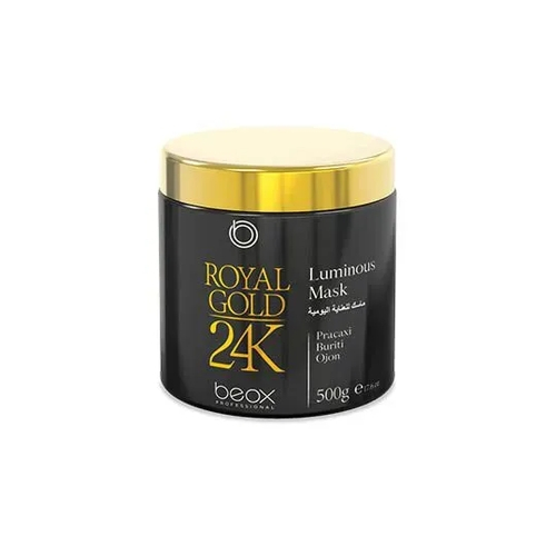 Linia Royal Gold 24k brazylijskiej marki Beox to 5 wydajnych, luksusowych produktów, które idealnie uzupełniają się nawzajem, dla spektakularnego efektu prostowania, wygładzenia i wzmocnienia włosów. Formuła produktów opracowana została z połączenia złota, szlachetnych substancji aktywnych z olejkami owocowymi znalezionymi w dżungli Amazońskiej. Zawarte w niej kompleksy olejków, protein i kwasów odbudowują i głęboko nawilżają uszkodzone pasma włosów. Zabieg pozostawia włosy wyjątkowo lśniące i zdrowe. Maska Luminous Mask (500 g) – Silnie odżywcza maska, która dogłębnie nawilża pasma włosów, a także przywraca im elastyczność, miękkość i jedwabistość. Opakowanie wystarcza na ok. 40 aplikacji. Zastosowana z produktem nr 1 i 2 daje nam pełny zabieg nanoplastii. W połączeniu z samym szamponem daje możliwość wykonania zabiegu pielęgnacyjnego uzupełnienia ubytków we włosie złotymi proteinami. Pojemność: 500g