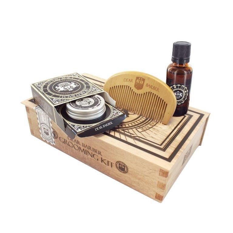 Beard Grooming zestaw do pielęgnacji brody / Dear Barber UK 3 niezbędne produkty do pielęgncji brody opakowane w pudełko ozdobne Beard Oil 30 ml olejek do pielęgnacji brody Beard Balm 30 ml balsam do pielęgnacji brody Beard Comb grzebień drewniany z moreli