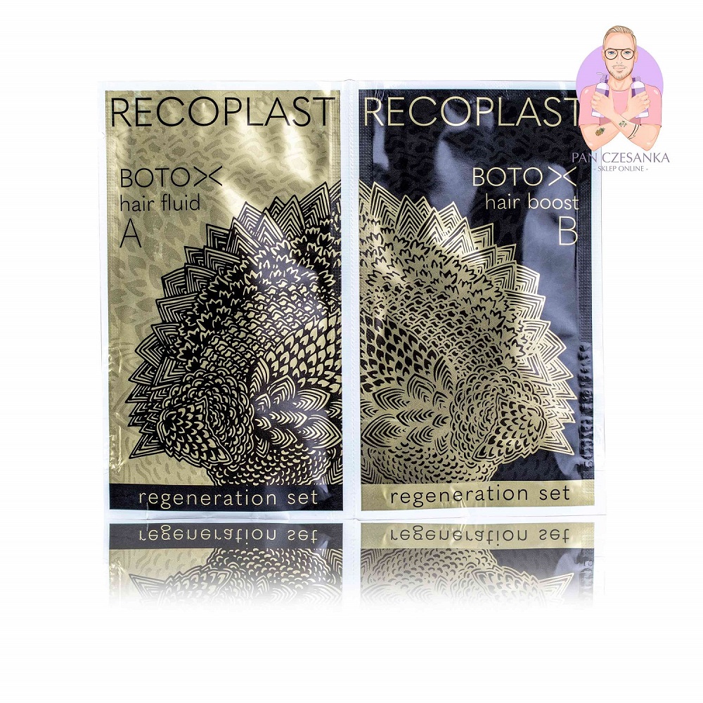 Recoplast kuracja do włosów botoks – intensywny zabieg regeneracji i odnowy suchych i zniszczonych włosów RECOPLAST Kuracja wypełniająca włosy 2×10 ml Botox zabieg 2 etapowy – fluid i booster – 2 x 10 ml saszetki które się łączy w miseczce i nakłada bezpośrednio na włosy FLUID + BOOST Skoncentrowana kuracja o natychmiastowym działaniu naprawczym i wypełniającym ubytki w uszkodzonych partiach włosa. Nadaje niezwykłej miękkości, naturalnego lśnienia i pozostawia włosy silniejsze i naturalnie piękne. Uzupełnia ubytki we włosach, pozosatwiając je odpowiednio nawilżone i odbudowane. Sposób użycia: w plastikowej misce wymieszać zawartość obu saszetek (boost i fluid). Całość mieszać energicznie czystym pędzelkiem w niemetalowej miseczce na gładką, kremową pianę. Nałożyć równomiernie na umyte i osuszone ręcznikiem włosy, starannie natrzeć najbardziej zniszczone części włosa. Pozostawić na 10 minut, a następnie dokładnie spłukać letnią wodą. Zabieg jest niezwykle regenerujący i nadaje efekt botoksu, który przywróci kształt i objętość włosów. Rezultaty są widoczne już po pierwszym użyciu. Pojemność: 2x12ml